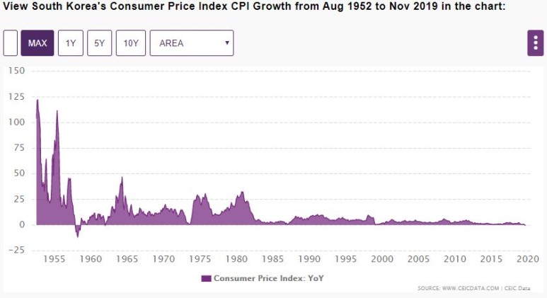 http://www.cei cdata.com/en/indicator/korea/consumer-price-index-cpi-growth 한국의 금리는 예전보다 높았던 것 같고 물가상승도 예전보다 높았던 것 같습니다.