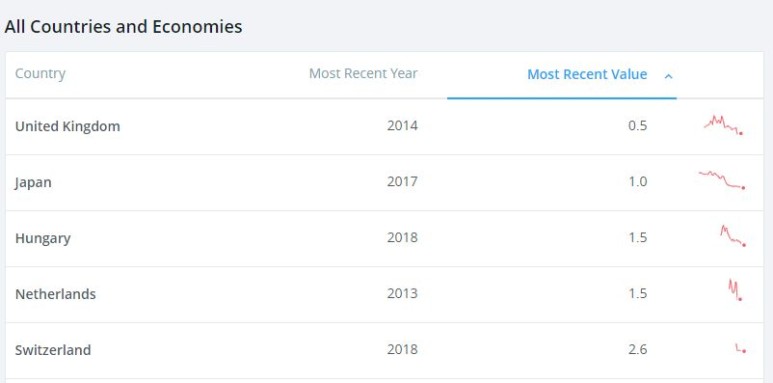 저금리 국가, https://data.worldbank.org/indicator/FR.INR.LEND?most_recent_value_desc=false 저금리 국가는 부유한 [1인당 GDP가 높은] 나라들이 많은 것 같습니다.