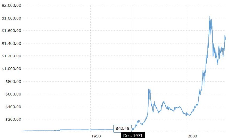 금값, https://www.macrotrends.net/1333/historical-gold-prices-100-year-chart 그 이전에는 금값이 미국 금과 연동돼 있어 금값이라는 말의 의미가 서양에서는 별 의미가 없었지만 닉슨이 71년 정도 베첼라를 시전하면서 금값이 미친 듯이 뛰게 됐고, 이 말은 달러 가격의 폭락을 의미할 수 있습니다.