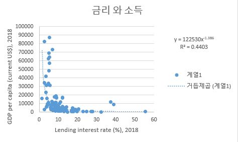 http://data.wor ldbank.org/indicator/NY.GDP.PCAP.CD?name_desc=falsehttps://data.worldbank.org/indicator/FR.INR.LEND?name_desc=false:실제 금리에 관한 자료는 세계적으로 구할 수 없는데 104개국 정도밖에 안 되는 국가나 지역에 절반 이상의 값이 없어서 구멍이 뚫려 있기는 하지만 대개 구하면 고금리 국가가 잘 살 것이라고 보기 어렵고, 또 그곳의 물가가 행복한 ‘안정된’ 느낌이라고 말하기 어려울 수도 있습니다.