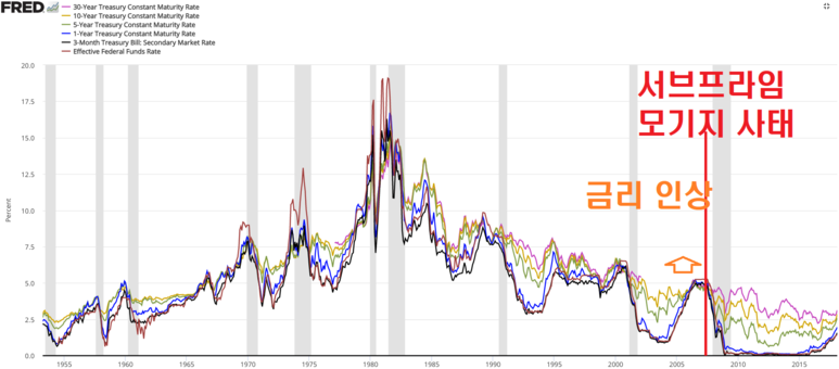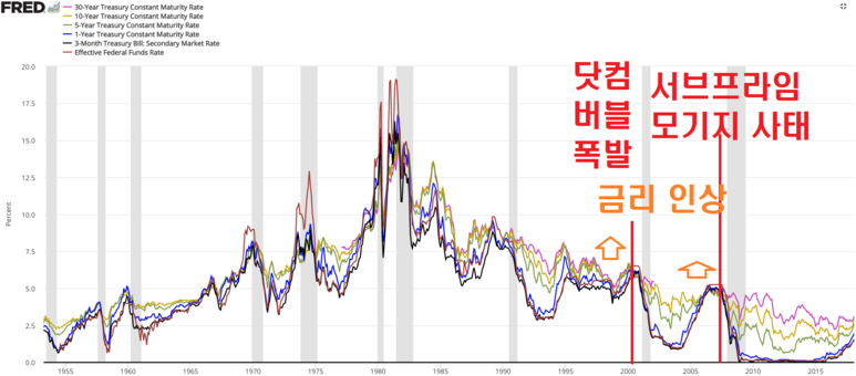 자세히 보면 닷컴 거품이 터졌던 2000년에도 금리가 높았습니다.