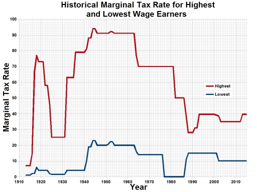 http://money.s tackexchange.com/questions/72622/how-did-historical-high-tax-rates-work-in-practice/72638#72638 미국이 세계대전을 이기고 또 지나서 닉슨 이전부터 있었던 일입니다만, 레이건 시대(1981~1989) 특히 세율이 내려갑니다.