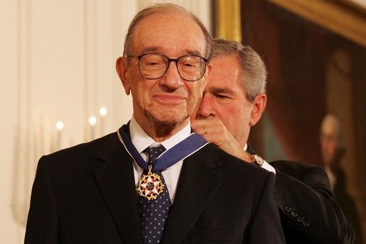 President George W. Bush presents the Presidential Medal of Freedom to Alan Greenspan, on November 9, 2005, in the East Room of the White House. 연준 의장에 임명되자마자 1987년 주가 폭락 사태를 빠르게 회복시켜 주목을 받았고, 90년대 경제 붐의 중심에 서서 ‘마에스트로’ [2]라는 명예로운 별명을 얻은 http://namu.wiki/w/% EC95% A8%.