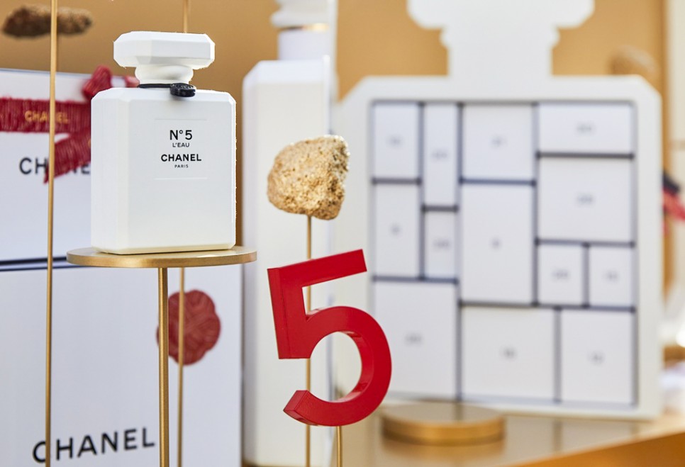 홀리데이 선물 상품도 전시되어 있다고 합니다.시대를 앞서 재활용 유리병과 자연 분해되는 페이퍼 펄프 소재의 박스로 만들어진 홀리데이 리미티드 에디션, N˚5 오드 파펜과 N˚5로 (L’EAU)를 만날 수 있었습니다.
