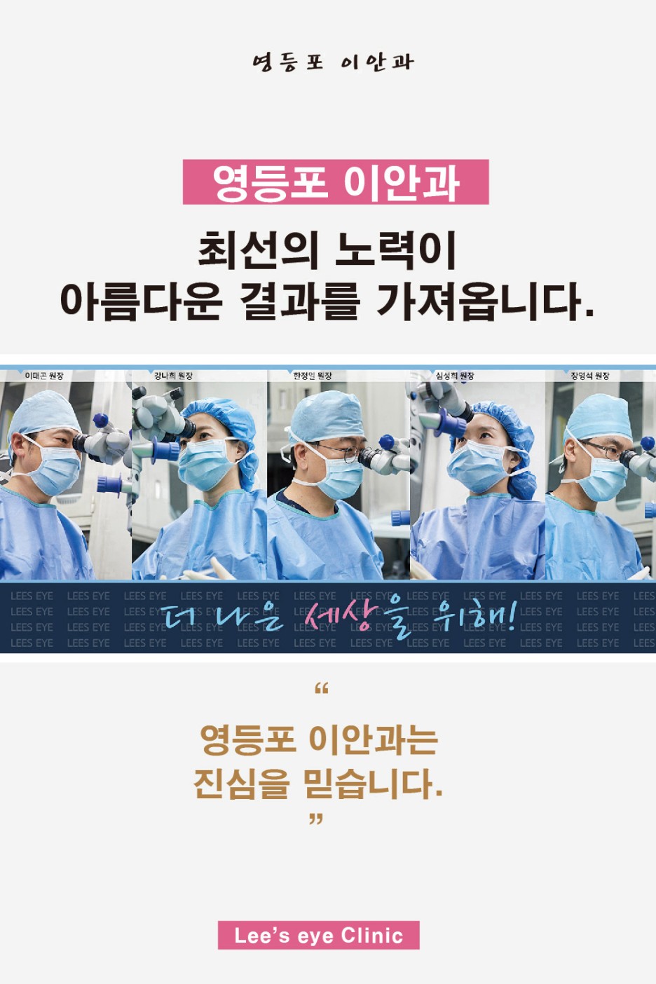 모든 과정은 오랜 경력을 가진 의료진이 1:1 맞춤 진료 및 치료를 통해 이루어지고 있는 만큼 눈에 별다른 이상이 느껴지지 않는 경우에도 정기검진을 받으러 내원하셔서 눈의 상태를 정확하게 파악한 후 필요한 경우 조기치료를 받으시길 권장드리며, 오늘 준비한 이야기는 여기서 마치도록 하겠습니다. 감사합니다