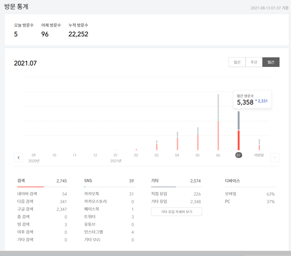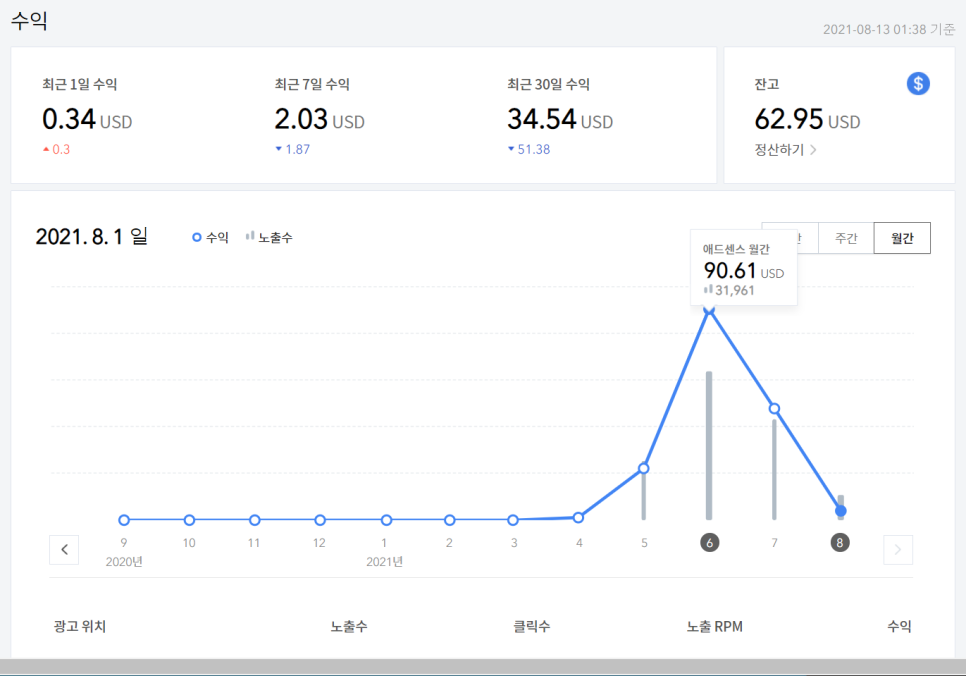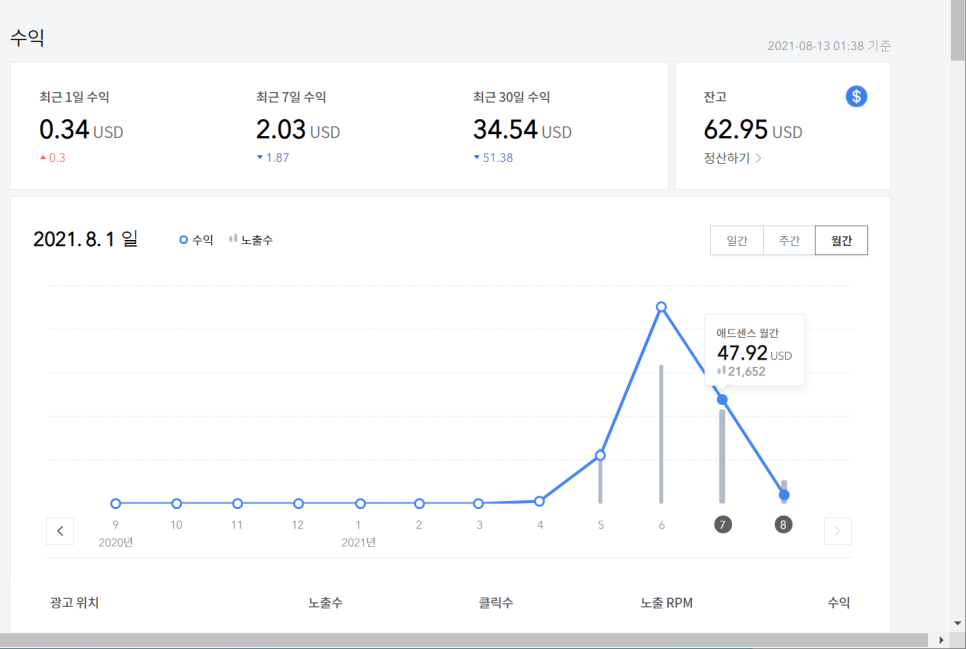 7월 수익, 6월 유입은 7,689에 $90.61의 수익을, 6월 21일 다음 저품질이 걸린 이후 유입이 급격히 하락하여 7월 유입은 5,358에 $47.92의 수익이 발생했습니다. 2개월간 순수 애드센스 수익 합계가 $108.53입니다. 약 12만원 정도 됩니다. 수익은 글의 주제와 광고 배치 방식, 그리고 방문자의 나이와 성향 등에 따라 크게 달라질 수 있습니다. 참고로 제 경우 구글 애드센스 광고를 한 번 클릭하면 1달러가 넘는 횟수가 꽤 많았습니다. 추후 구글 어드센스 사이트를 리뷰하는 시간을 별도로 가질 예정입니다.