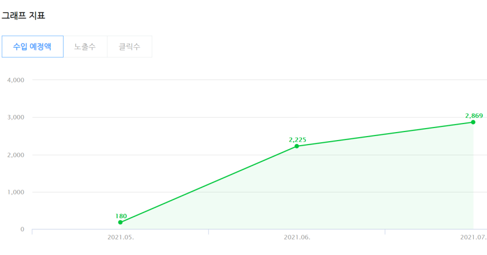 네이버 애드포스트 수익, 단위원, 5월 수익 180원, 6월 수익 2225원, 7월 수입 2869원입니다. 월간 유입량이 티스토리 유입량보다 적었지만 수익 결과물은 너무 낮네요.