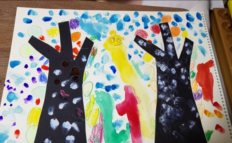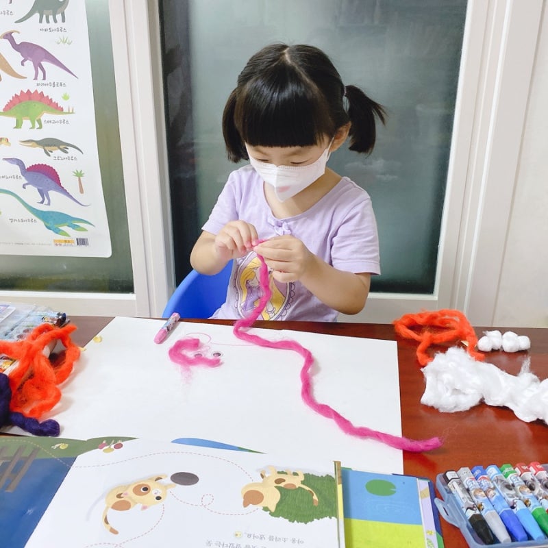 이후 멋진 작품이 뿌듯한지 갑자기 예술혼을 불태우는 아들.남자아이들이 미술에 흥미를 갖지 않는 것은 아마 완성도 높은 작품 도달이 어려워서 혹은 산만해서 그런 것 같은데, 홍 선생의 미술은 산만한 아이에게 휘둘리지 않고 그렇게 될 수 있다니?알고 다양한 재료를 활용해 선생님은 조력자로서 완성도를 높여주시는데 마치 아이가 거의 한 것처럼 느끼게 해주신 이후 다시 흐트러진 집중력을 물감으로 끌어올려주셨다.