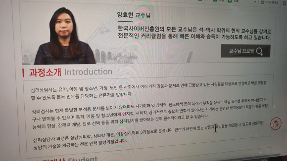 한국사이버진흥원 한국사이버진흥원에는 상담에 도움이 되는 교육과정이 많이 있으며 가족심리상담사, 감정코치, 문학심리상담사, 심리상담사 등 중에서 필자는 심리상담사 자격과정을 신청했다.