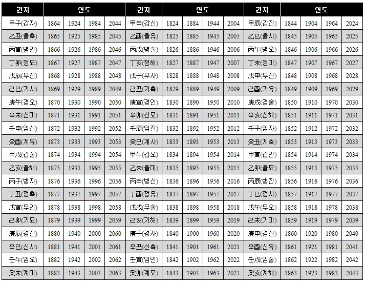 [로]갑자(갑자·을축(을축)·병인(병인, 정묘(정묘)·무진(무진)·기사(기사)·경오(경오)신미(신미)임신(임신)계유(계유)갑술(갑술)을해(을해)·병자(병자호란)정축(정축)·무인(무인)·기묘(기묘)·경연(경진)·신사(신사)·임오(임오)·계미(계미)·갑신(갑신)·을유(을유)·병술(병술)·규정(정해년)무자(무자)·기축(기축)·경인(책)신묘(신묘)·임진(임진)·계사(계사)갑오(갑오·을미(을미)·병신(병신)·석유 정제(정유)·무술(무술)·기하(기해)·경자(경자)·신축(신축)임인(임인)·계묘(계묘)갑진년(갑진년)을사(을사늑약)·병오(병오)·정미(정미)·무신(무신)·기유(기유)·경술(경술)신해(신해· 책임자(임자)·계축(계축)·갑인(갑인)·을묘(을묘)·병진(병진)·정사·무오(무오)·징조(기미)·갱신(경신)·신유)·임술(임술)·계해(계해).