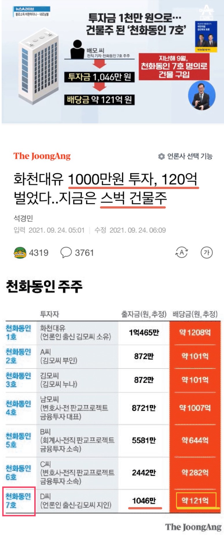 화천대 가지세요. http://www.ggeco.co.kr/news/article.html?no=115110 [경기경제신문] 익명의 제보자는 이재명 후보, (주)화천대유자산관리란 누구의 것입니까?(8월 31일) 및 이재명 후보! 적폐공동체를 해체하라며 화천대유 관련 의혹을 제보해 왔다. 이번에는 화천대유의 부정부패 의혹에 대한 추가 제보가 있어 본보는 www.ggeco.co.kr