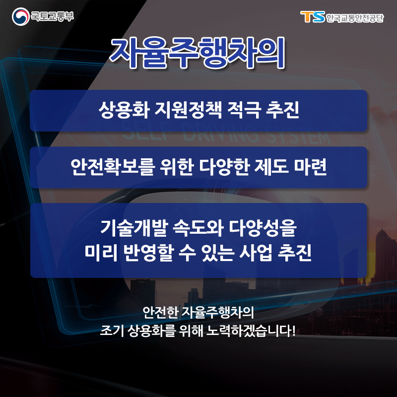 자율주행차 상용화 지원 정책을 적극 추진하고 안전을 확보하기 위한 다양한 제도를 마련하여 기술개발의 속도와 다양성을 미리 반영하는 사업을 시행합니다.