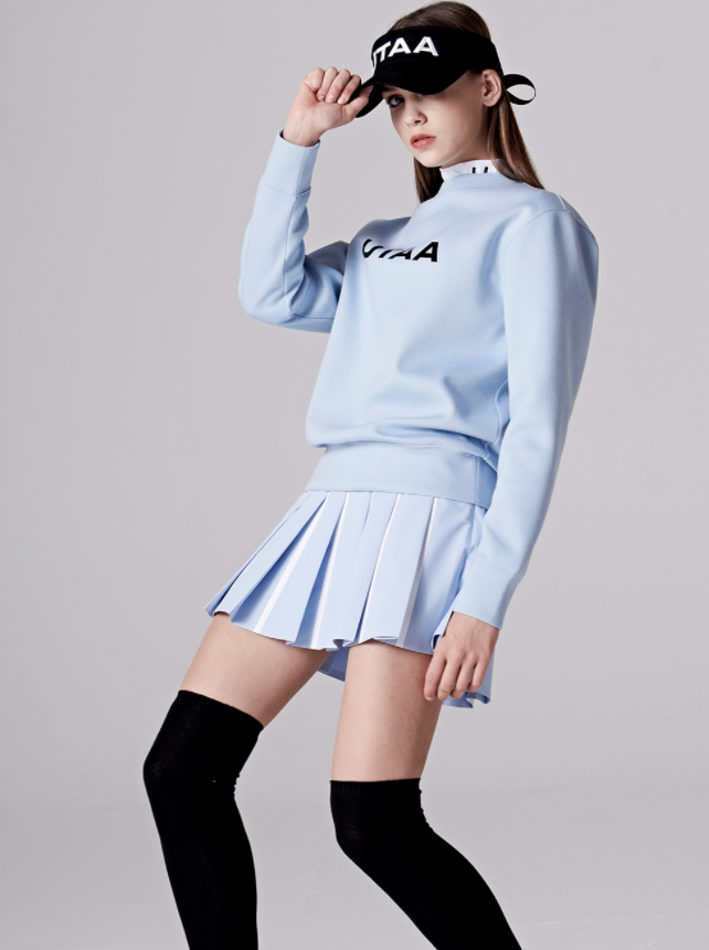첫 번째 의상에서도 착용하신 UTAAGOLF 모자를 재착용하면서 머리부터 발끝까지 UTAAGOLF 아이템을 매칭해주셨습니다.장예원 이미지가 귀여운 동안 이미지가 강해서 캐주얼하게 입는 게 정말 잘 어울리는 것 같아요.올화이트나 올블랙 컬러에 질렸다면 이렇게 스카이블루 풀장비는 너무 멋스러운 느낌도 없고 부담없이 입을 수 있는 컬러인 것 같네요! 플리츠 스커트도 평범하지 않고 스커트 결 사이마다 흰 원단을 덧대 스커트의 움직임에 따라 디테일이 보이도록 해준 것이 매력적이라고 생각합니다.스윙할 때 스커트가 펄럭이면서 더 입체감 있는 영상이 완성될 것 같아요~