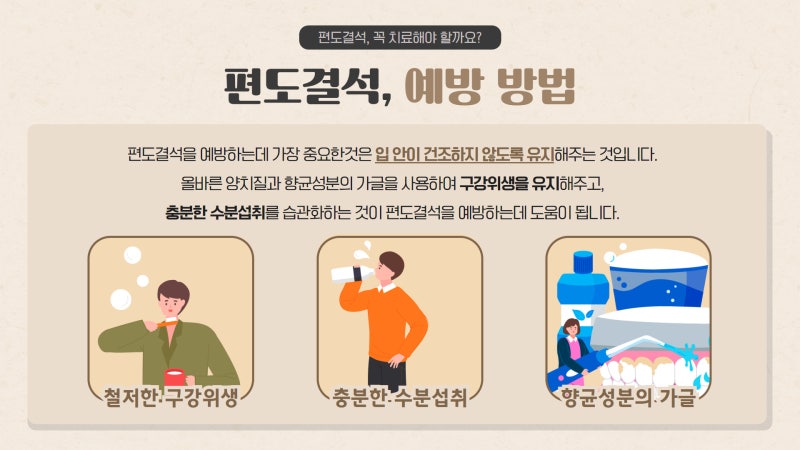 젊고 건강한 사람으로 편도결석이 처음 발생한 경우 자연 치유되기도 합니다.그러나 결석을 유발하는 환경이나 습관이 지속되면 언제든지 재발할 수 있습니다.이를 예방하기 위해 항생제 등 약물 처방과 함께 생활습관 개선이 반드시 이루어져야 합니다.평소 수분 섭취를 충분히 하고 식후 양치질을 꼼꼼히 하는 것, 양치 후 항균 성분이 있는 가글액으로 입안을 잘 헹구는 것 등의 습관이 편도결석 재발 방지에 도움이 됩니다.