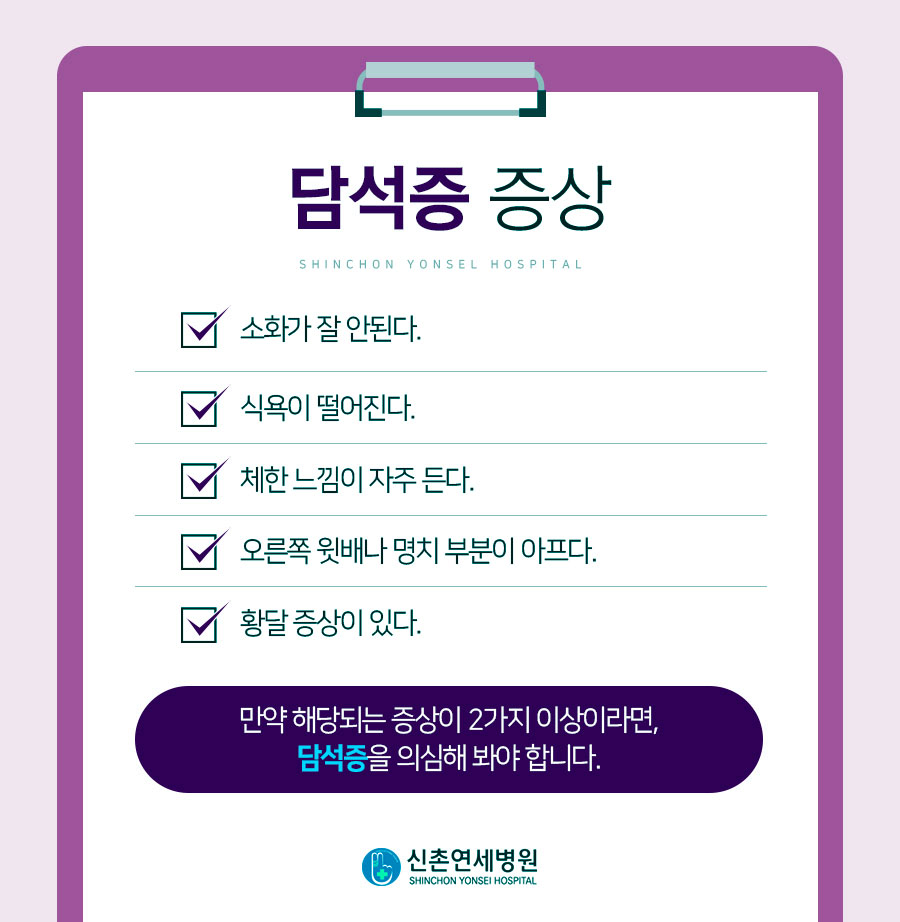 소화가 잘 안 되거나 식욕이 떨어지거나 속이 더부룩할 경우에는 오른쪽 상단의 배나 명치가 아프고 황달 증상의 두 가지 이상 증세가 있다면 담석증을 의심해야 합니다.