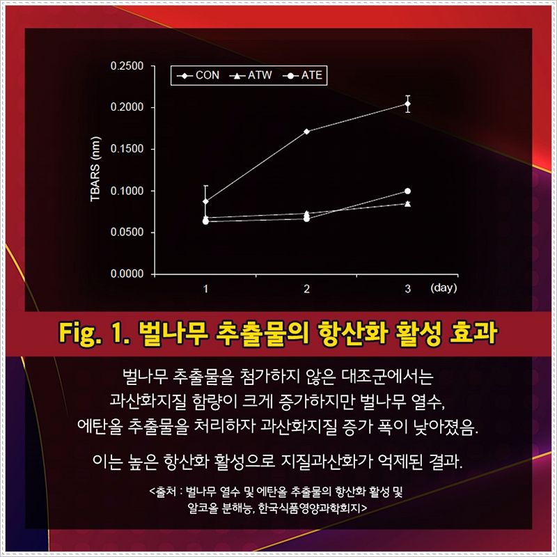 또한 한국식품영양과학회지에 게재된 논문에 따르면 해당 나무의 추출물이 강력한 항산화 활성을 발휘하여 과산화지질을 현저하게 억제한다는 내용을 확인할 수 있습니다.