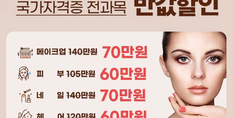 현재 청주미용학원에서는 국가자격증 전과목 반값 할인행사를 실시하고 있습니다.청주미용학원을 찾으시는 분들은 아래 링크에서 상담 신청해보세요!