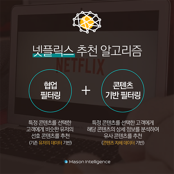 넷플릭스는 영화 추천을 위해 ‘협업 필터링’과 ‘콘텐츠 기반 필터링’ 방식을 조합해 콘텐츠를 추천합니다.