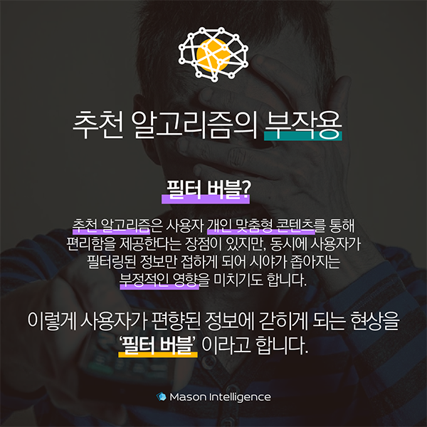 추천 알고리즘은 사용자 개인 맞춤형 콘텐츠를 제공해 사용자에게 편리함을 제공한다는 장점이 있지만 동시에 사용자가 필터링된 정보만 접하게 돼 시야가 좁아지는 부정적인 영향을 미치기도 합니다.