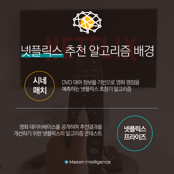 DVD 대여 서비스로 시작한 넷플릭스는 개인화된 추천을 위해 자체적으로 DVD 대여 정보를 기반으로 한 영화 추천 알고리즘인 ‘시네매치(cinematch)’를 구축했습니다.