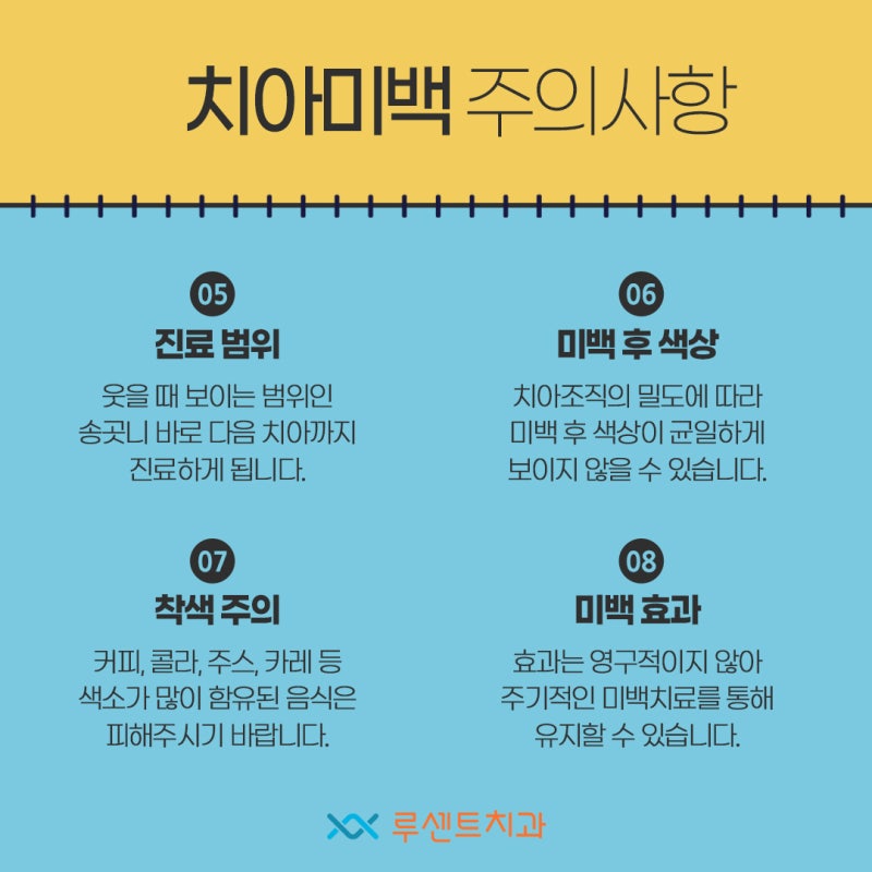 이러한 이유로 눈에 띄는 변화를 희망하시는 분들은 치아 미백에 대해 알아보고 내원을 결정하셔야 합니다. 치아 미백은 노란색으로 변색된 치아를 단시간에 투명하고 하얗게 만드는 시술입니다. 어떻게 보면 오래 사용한 치아가 변색되는 것이 자연스러운 일이라고 할 수 있습니다. 커피를 즐겨 마시거나 흡연하는 사람은 입 안의 박테리아나 치석에 의해 변색되기도 합니다. 선천적으로 조금 더 변색될 수도 있는데요. 결론부터 말하면 한번 변색된 치아는 양치질, 미백 치약으로는 이전 흰색으로 되돌리기 어렵습니다.또한 심하게 변색된 치아는 콤플렉스로 여겨지는 경우도 많은데요. 면접이나 결혼 같은 중요한 일정을 앞두고 있다면 치아 미백을 통해 개선해 보는 것도 좋습니다. 그럼 치아 미백 후에 주의할 것은 없을까요? 그렇지는 않은데요. 주의사항은 시술 후 약 2시간은 음식물 섭취를 자제해야 합니다. 그리고 일주일 정도는 커피, 카레 같은 착색이 가능한 음식을 피하는 것이 좋습니다.치아에도 우리 피부처럼 모공 같은 작은 구멍이 있어요. 거기에 색소 성분이 들어가면 변색을 일으킬 수 있으니 색깔이 짙은 음식이나 커피, 담배는 반드시 삼가시기 바랍니다. 콜라, 색소성 탄산음료, 토마토 주스도 해당되니 피해봅시다. 다음 주 사항은 불소 치약을 피하는 것입니다. 이 제품은 중화작용을 유발하여 미백 시술을 비활성화 할 수 있습니다. 반드시 치약을 사용하기 전에 성분을 확인해 보세요.마지막 주의 일, 사람에 따라 차이는 있지만 잇몸이 약간 시린 것 같은 생각이 듭니다. 불편하시겠지만 보통 하루나 이틀 정도면 완화되니까 너무 걱정하지 마세요. 오늘은 이렇게 치아 미백 주의사항에 대해서 말씀을 드렸는데요. 저는 다음에 다시 새로운 치아 정보로 돌아올 거예요. 감사합니다。마지막 주의 일, 사람에 따라 차이는 있지만 잇몸이 약간 시린 것 같은 생각이 듭니다. 불편하시겠지만 보통 하루나 이틀 정도면 완화되니까 너무 걱정하지 마세요. 오늘은 이렇게 치아 미백 주의사항에 대해서 말씀을 드렸는데요. 저는 다음에 다시 새로운 치아 정보로 돌아올 거예요. 감사합니다。