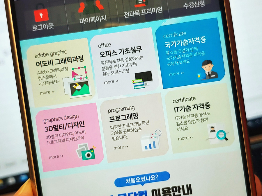 어도비 그래픽 과정, 오피스 실무 기초, 국가기술 자격증, 3D 멀티/디자인, 프로그래밍 언어 등 정말 없는 강의 없이 모두~ 있습니다. 기초부터 고급 심화과정, 컴퓨터 자격시험을 위한 이론부터 기출문제 답안까지 1422개 강좌라니 정말 대단하네요. 현재는 1422개 강좌이지만, 계속 갱신하고 있습니다.