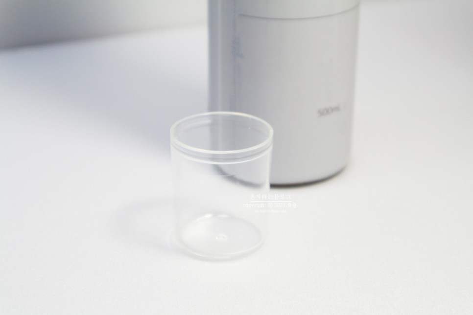 이게 좋은 게 기본 뚜껑 말고도 이렇게 컵에서 계량기로 사용할 수 있는 별도의 뚜껑이 함께 제공된다는 것~보통 1/3 정도만 넣고 씻는 걸 추천한다고 합니다.