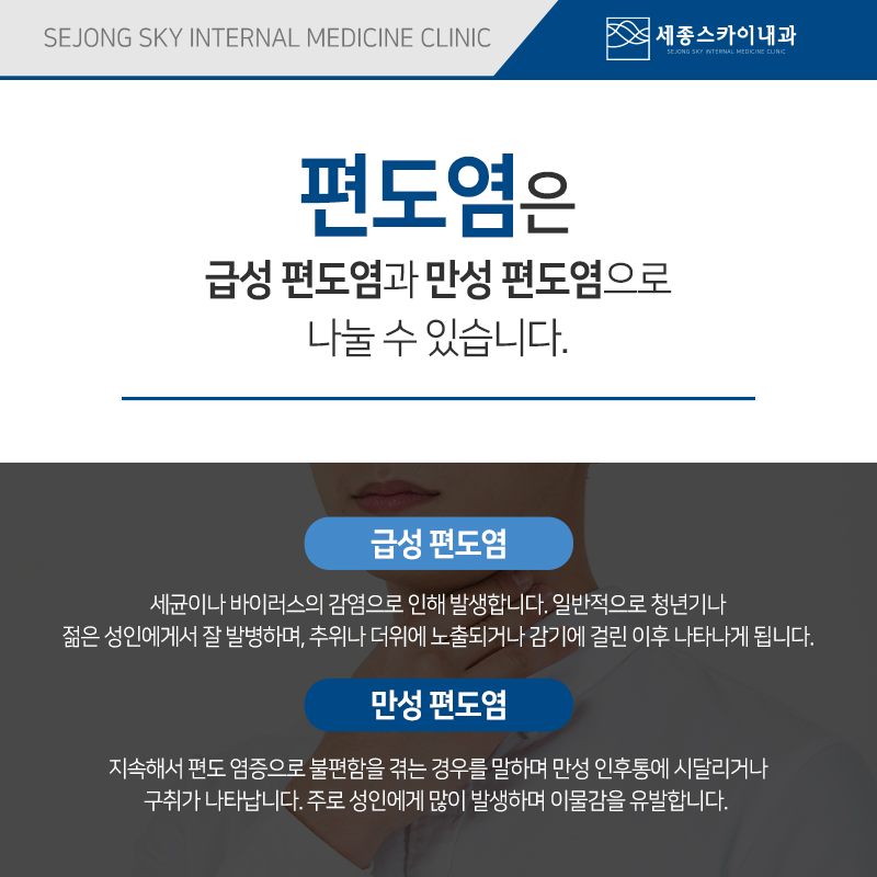 편도염은 급성 편도염과 만성 편도염으로 나눌 수 있습니다.급성 편도염 : 세균이나 바이러스의 감염으로 발생합니다.일반적으로 청년기나 젊은 성인에게서 흔히 발병하며, 추위와 더위에 노출되거나 감기에 걸린 후에 나타나게 됩니다.