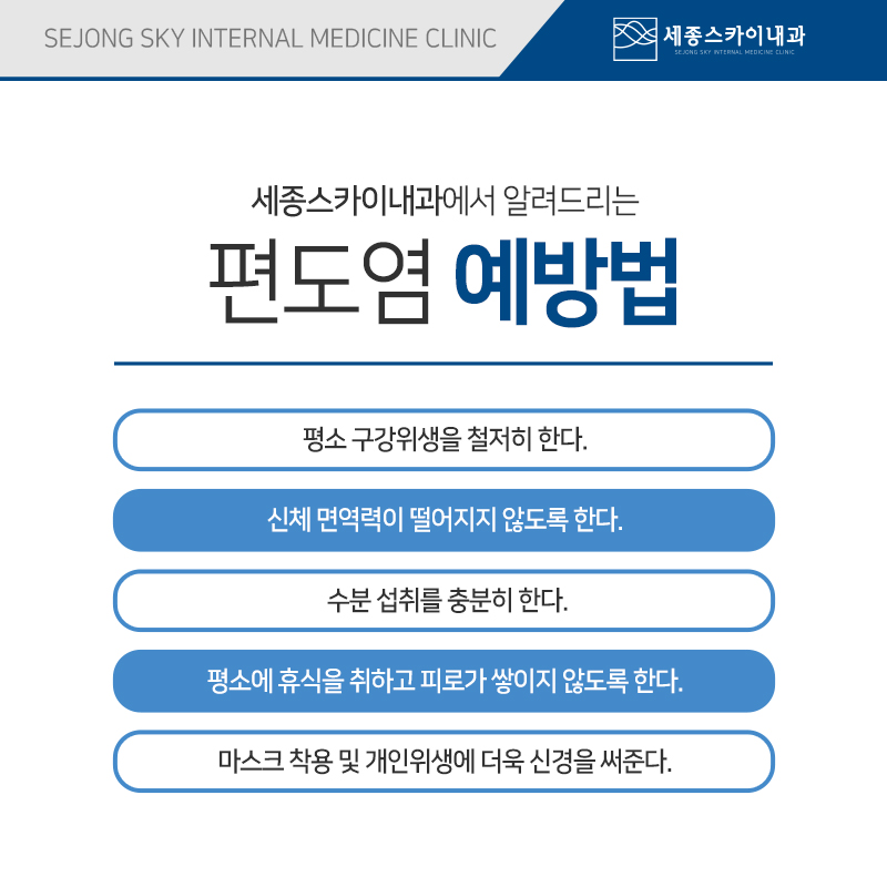 편도염을 예방하기 위해서는 평소 구강위생을 철저히 하고 신체 면역력이 떨어지지 않도록 하는 것이 중요합니다. 편도 점막이 건조하면 점막이 민감해져 이물질을 제거하는 기능을 제대로 수행하기 어렵기 때문에 물을 충분히 섭취하도록 해야 합니다. 또한 충분한 휴식을 취하고 면역력 회복에 힘쓰고 인후염으로 음식을 삼키기 어려운 경우에는 부드러운 음식을 먹는 것이 좋습니다.편도염 확산을 막기 위해 마스크 착용과 손 씻기 습관 등 개인위생에 더욱 신경 쓰는 것도 도움이 됩니다.