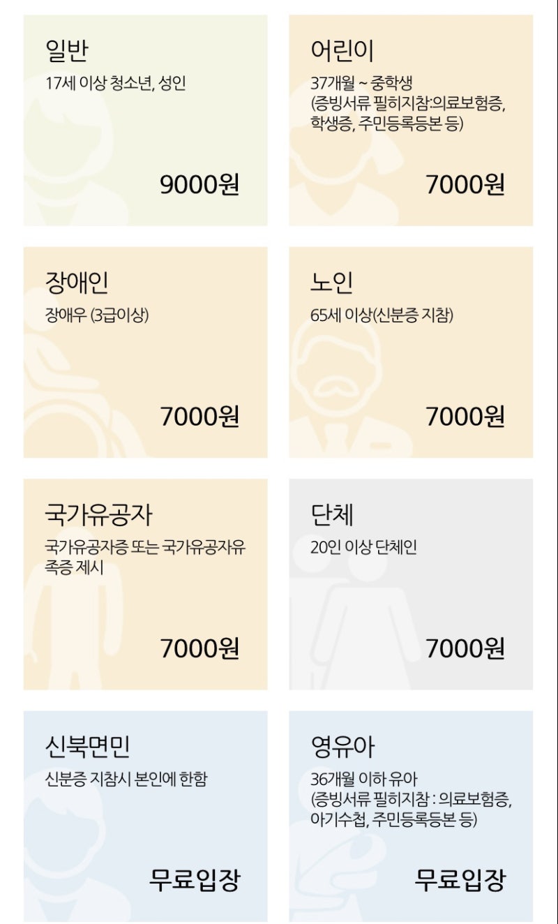 영업시간일~금: 오전10시~오후10시 토요일: 오전10시~오후10시 매주 수요일 휴관(수요일이 공휴일일일 경우 정상운영) 입장료 대인(17세 이상): 9,000원 소인(36개월 이상): 7,000원~36개월 미만 아기/신북면 주민 무료 점등시간 오후5시