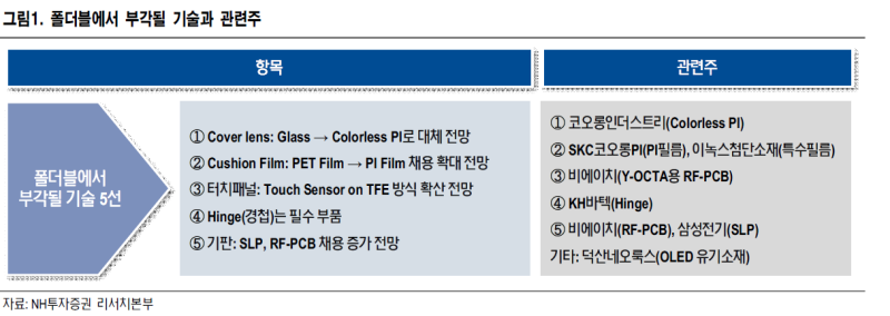 폴더블폰에서 주목하는 부품은 힌지와 커버 윈도우, 보호필름, RF-PCB 등 디스플레이 관련 부품입니다. 애플이 2023년 새로 폴더블폰을 공개할 전망이니 미리 봐두는 게 좋을 것 같습니다. 힌지:KH바텍