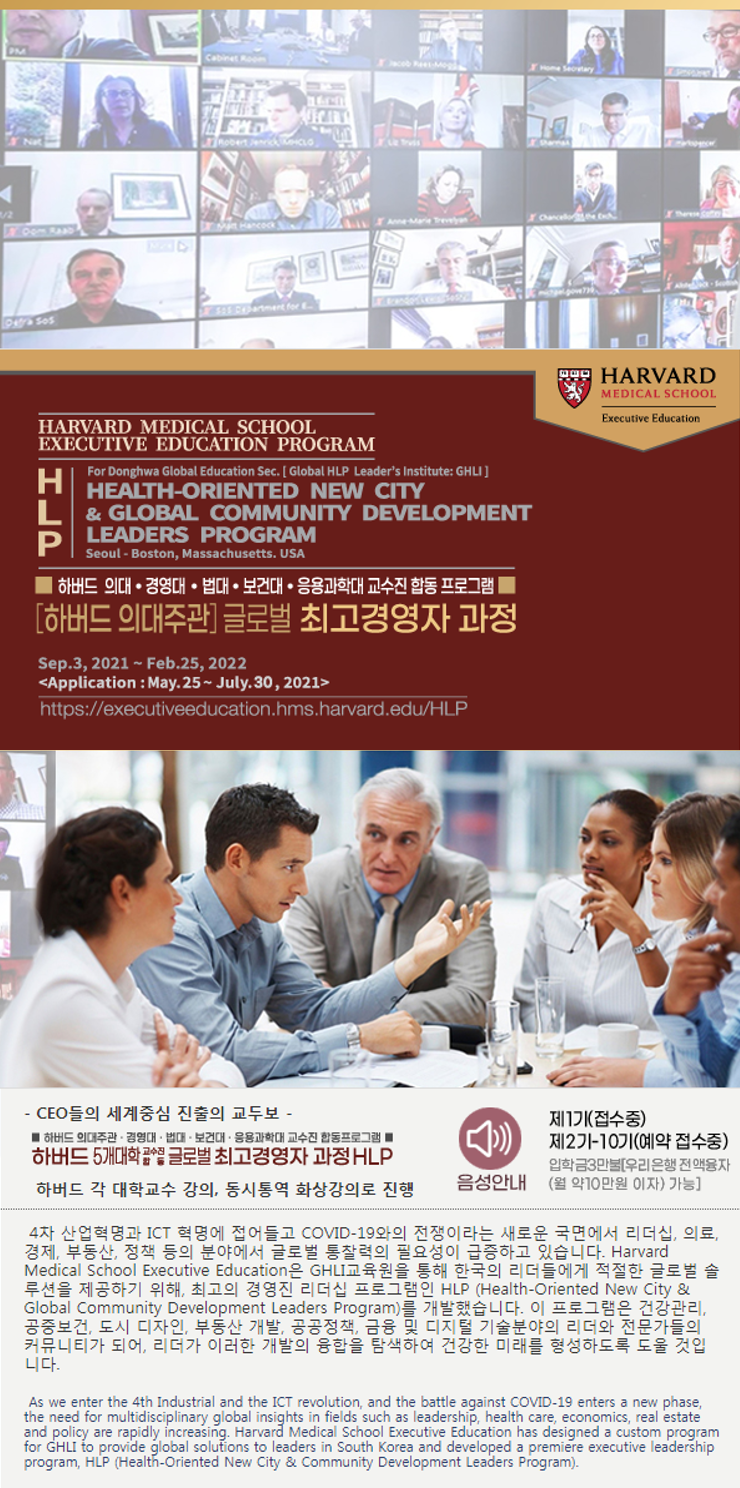 The Harvard Global CEO Program (HLP), organized by Harvard Medical University and jointly operated by professors from five universities, including business, law, health, and applied science universities, has been launched in Korea. With the world paralyzed by the new coronavirus, construction, management, health, advanced science, artificial intelligence, and other fields centered on human health gathered under the name of Harvard University and organized by Harvard Medical University. If you’re a CEO, it’s a great opportunity to expand your global perspective.