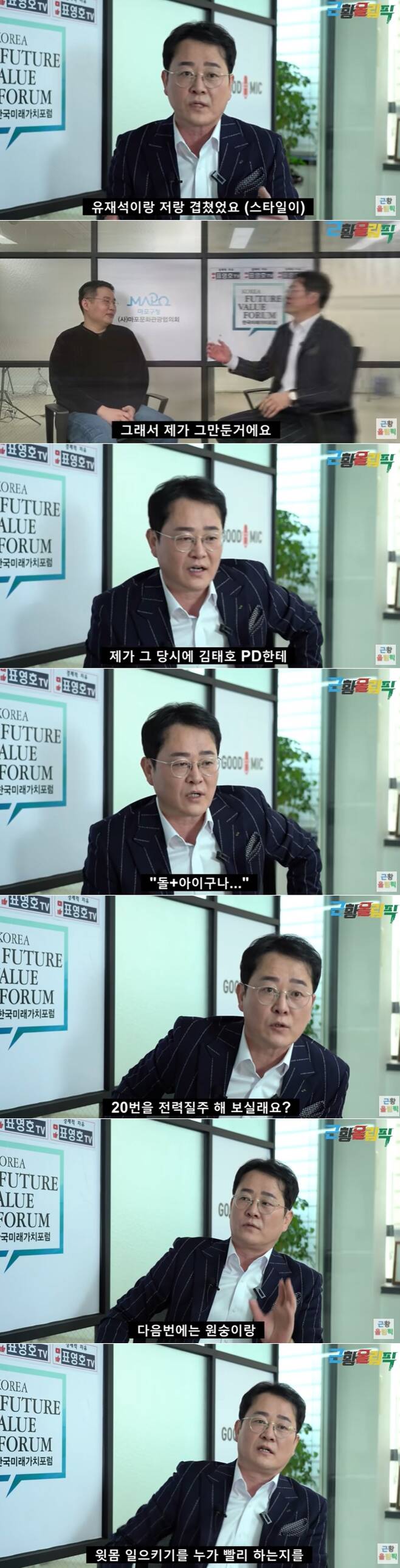 유튜브 채널 ‘근황 올림픽’ 영상의 갈증©뉴스1 (서울=뉴스1) 김학진 기자 = 개그맨 출신 방송인 표현호가 MBC ‘무한도전’ 출연 당시를 회상했다.지난 28일 유튜브 채널 ‘근황올림픽’에서는 “TV를 틀면 방송인. 유재석 박수홍 김용만 등과 함께 절친한 그룹 멤버로 방송에서 재역할을 다한 개그맨 표영호 씨를 만났습니다. ‘무한도전’은 물론, ‘노블레인 서바이벌’ 등 인기 예능에서 왕성한 활동 중 방송을 그만두고 떠나야 했던 사연, 그리고 강연 전문가로 활동 중인 최근 근황을 들어봤다”는 소개와 함께 표영호와의 인터뷰 영상을 공개했다.’무한도전’ 초기 멤버로 활약했던 표현호는 당시를 떠올리며 “처음 갔더니 PD가 이상한 아이들만 모아놓은 것이다. 어떤 놈은 “가냐~ 가냐~”며 시끄러워 죽을 것 같았고, 어떤 놈은 뚱뚱한 놈이 한 바퀴 돌면 흙만 묻어도 웃겼다. 또 다른 놈은 “나 좀 챙겨줘”라며 소리를 질렀다”고 당시 기억을 더듬었다.이어 “나는 아무것도 할 일이 없었다. 유재석과 내가 (스타일이) 겹쳤다며 그럼 누가 그만둬야 하나. 회사 사장과 과장이 하는 일이 겹치면 누가 그만둬야 할까. 제가 그래서 그만뒀다고 솔직하게 밝혀 웃음을 안겼다.표영호는 무한도전 당시 했던 각종 불가능한 미션에 대해서도 떠올렸다. 그는 “목욕탕에 물을 가득 담아 사람이 퍼내는 속도와 하수도에서 자연스럽게 물이 빠지는 속도 중 어느 것이 빠른지를 비교하는 미션이 있었다. 그 미션을 아침 6시부터 밤 11시까지 녹화했다. 그렇게 병원으로 옮겨졌다. 체력의 한계를 느꼈다고 말했다.또 전철과 달리기를 한다고 한다. 100m를 20회 이상 전력 질주했다. 한두 번 큰일이다. 그런데 다음 번에는 원숭이와 복근을 누가 빨리 하는지 하는 것이다. 그래서 당시 김태호 PD에게 “이거 돌아가는구나”라고 설명했다.표영호는 왕성한 활동을 하며 방송과 거리를 두게 된 이유는 새로운 삶을 살고 싶었기 때문이라고 말했다. 그는 “계속 빙빙 도는 삶, 그리고 전전긍긍하는 것, 쓰여야 하는 입장에서는 불안감을 느꼈다”고 말했다. 하지만 그는 “방송이 아닌 사업을 시작해 사회생활에 어려움을 느낄 때는 방송하던 시절이 그립기도 했다”며 “그때가 가장 편했구나 싶기도 했다”고 털어놨다.그러면서 가끔 심신이 상하는 경우가 있었다. 간헐적 우울증, 기분부전장애 등을 앓았다. 예전에 활동할 때는 연예인끼리 수다 떨면서 풀었다. 유재석이랑 같이 대화를 많이 했다. 유재석이 우리 집에 아침 9시에 와서 떠들고 다음날 아침 9시에 가기도 했다. 그런데 사업을 하다 보니 누가 얘기할 사람도 없고 대화를 나눌 상대가 없다는 외로움이 있다고 토로했다.”10년 전부터 강연 교육 프로그램을 만들어 사업을 하고 있다”고 밝힌 표현호는 강연을 다니며 감동받았던 기억을 떠올리며 “전국을 돌아다녔다. 투어 콘서트도 했다. 문화관광을 활성화하는 역할을 봉사활동으로 하고 있다. 최근에는 중견기업인들과 오피니언 리더들을 맞아 소통하고 공부하는 모임을 만들었다고 근황을 전했다.마지막으로 올해로 데뷔 30주년이 됐다는 표현호는 “목표를 달성하려고 살아왔는데 이제는 행복해야겠다는 생각이 든다. 함께 행복한 삶을 살았으면 좋겠다고 감사 인사를 전했다.한편 연예계에서 ‘주식’ 이야기가 나오면 늘 거론되는 표현호는 주식에서 실패와 성공을 모두 맛본 인물이기도 하다.그는 종잣돈 1000만원으로 15억원을 만들었지만 결국 15억원을 모두 잃었다는 이야기로 연예계 대표 주식 실패 사례로 거론되기도 한다. 하지만 그는 지난해 3월 뉴스1과의 인터뷰에서 실패를 맛본 뒤 2년간의 와신상담 끝에 다시 주식을 시작해 25억원의 수익을 내고 주식시장을 떠났다고 밝혀 다시 화제가 되기도 했다.그는 현재 강연문화기획과 문화콘텐츠 개발 및 스토리를 주는 스토리콘텐츠 전문가로 활동하고 있으며 소통과 협력을 주제로 연간 200회 이상의 기업 및 기관단체 초청 강연을 진행하고 있다.