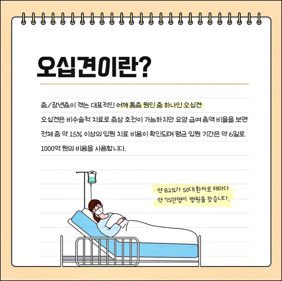 특히 요즘같이 추운 날씨에는 낮은 기온에서 근육이 수축함에 따라 긴장 및 경직을 유발하는 관절통이 심해질 수 있는 만큼 오십견이 의심될 경우 즉시 병원을 찾아야 합니다. 오십견의 주된 원인은 노화로 인한 어깨관절 주위 연부조직의 퇴행성 변화, 바르지 못한 자세, 운동부족으로 인해 근육에 노폐물이 쌓이는 원인 등으로 인해 발생합니다.