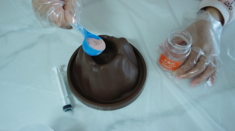 여기 화산 모형에 베이킹 소다와 구연산을 넣고 물을 넣는 겁니다.