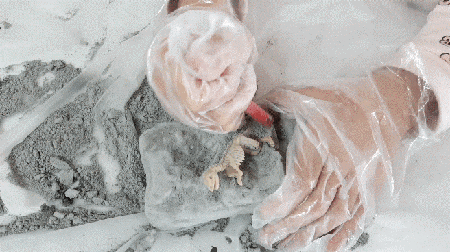 석고 키트 안에 공룡 화석을 발굴하는 발굴 키트입니다