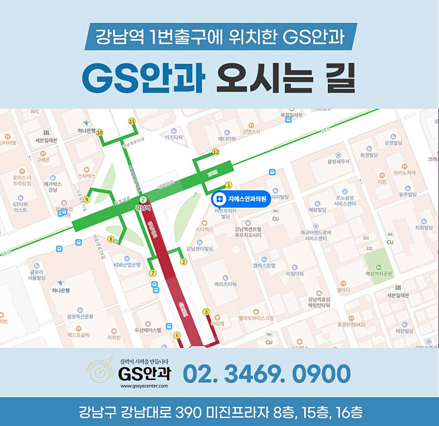 강남역 1번 출구 바로 앞에 있는 미진플라자 8층, 15층, 16층에 고객님의 앞날을 밝혀줄 의사가 대기하고 있으니 무서운 마음을 잠시 두고 오시는 것이 좋습니다. 병원에 오는 동시에 질병의 진행을 멈출 수 있을 뿐만 아니라 보다 밝은 눈에 대한 희망도 가질 수 있습니다. 어떤 질병이라도 조기에 발견하여 주치의 소견에 따라 처치하면 건강하게 노후를 보낼 수 있습니다.