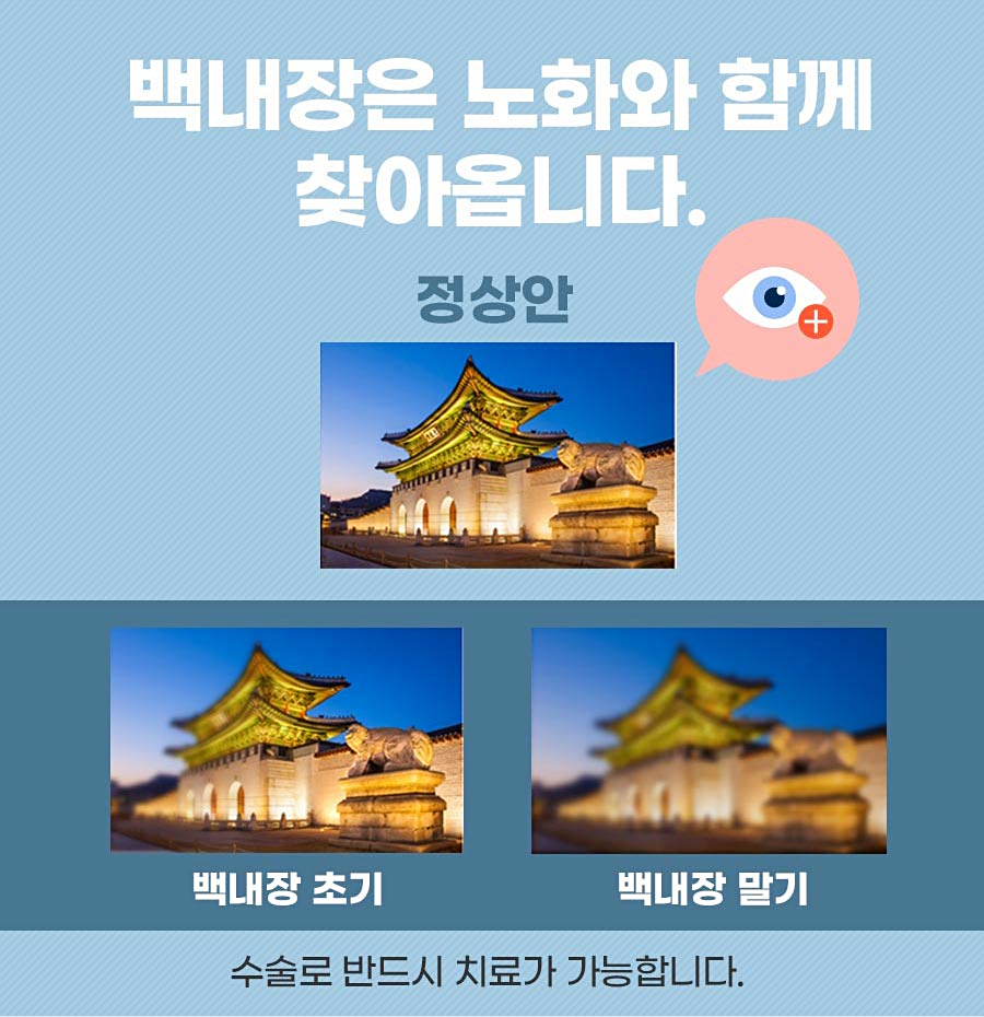 저희 병원은 노인성 눈병 우수기관으로 선정된 사례에서 알 수 있듯이 자타가 공인하는 명실상부한 백내장 특화병원입니다. 오랫동안 진료의사나 집도의가 변하지 않은 곳으로 유명하기 때문에 매우 민감한 신체기관인 눈을 안심하고 맡길 수 있는 곳임을 자부합니다.