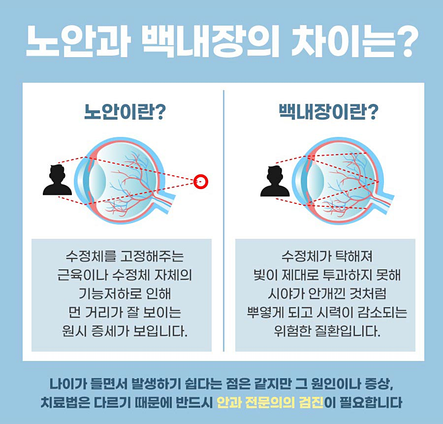 노안은 수정체를 고정해주는 근육이나 수정체 자체의 기능 저하로 인해 먼 거리가 잘 보이는 원시 증상이 보이고, 백내장은 수정체가 혼탁해 빛이 제대로 통과되지 못해 눈앞이 안개가 낀 것처럼 희어져 시력이 떨어지는 위험한 질환입니다. 두 질병 모두 퇴행성으로 노인에게 걸리기 쉬우나 원인과 증상은 물론 치료방법도 다르므로 안과를 방문하여 의료진의 검진을 받고 결과에 따라 적절한 관리를 해 주시면 감사하겠습니다.