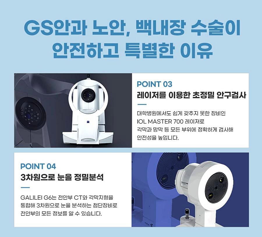 이 밖에도 우리 병원이 안정적인 이유는 대학병원급의 우수한 장비로 각막과 망막 등 모든 부위를 꼼꼼히 검사해 안정성을 더욱 높이는 것입니다. 전안부 CT와 각막 지형을 통합하여 3차원에서 눈을 분석하고 환자에게 맞는 방법을 찾는 것입니다.