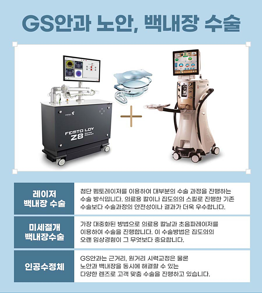 뛰어난 성능을 자랑하는 의료장비와 우수한 의료인력이 있는 백내장 수술을 잘하는 곳에서 하는 시술이 안정적이고 특별한 이유는 많지만 몇 가지 소개해드리고자 합니다. 세계적인 안과센터에서 인기 초음파 기기인 센추리온을 사용하여 약 2mm 이내의 미세 절개로 손상 부위가 적고 회복이 빠르고 통증이 적습니다. 환자의 생활방식에 따라 적합한 단초점 또는 다초점 인공수정체를 맞춤 제작하여 시술하기 때문에 시력의 질과 만족도가 높습니다.