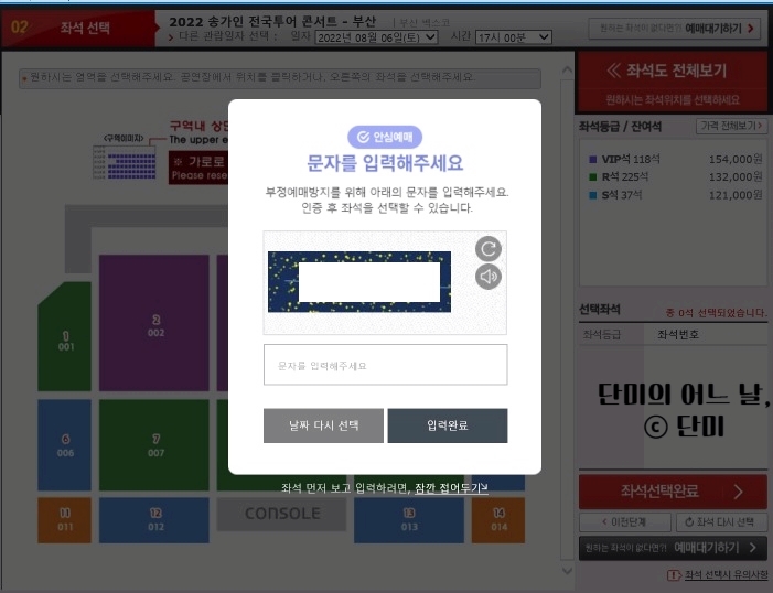안심 예매 창이 뜨며 대문자의 문자를 입력해야 한다.이 창문은 규모가 크거나 매크로를 돌려 부정 예매를 할 가능성이 높은 콘서트나 공연에 주로 나오는 것으로 알려졌다.