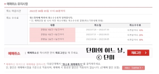 아..? 생각해 볼수록 무대와 거리가 좀 먼 것 같은데, 앞으로 자리를 옮겨볼까? 3구역은 앞자리가 없고, 4구역에 2석 달린 좌석이 있어서 갈아탔다.예약 당일 밤 12시 이전 취소 시에는 취소 수수료가 없다.하지만 하루가 지나 티켓 금액의 10% 취소 수수료가 붙었다. (저의 32,800원 안녕하세요..)