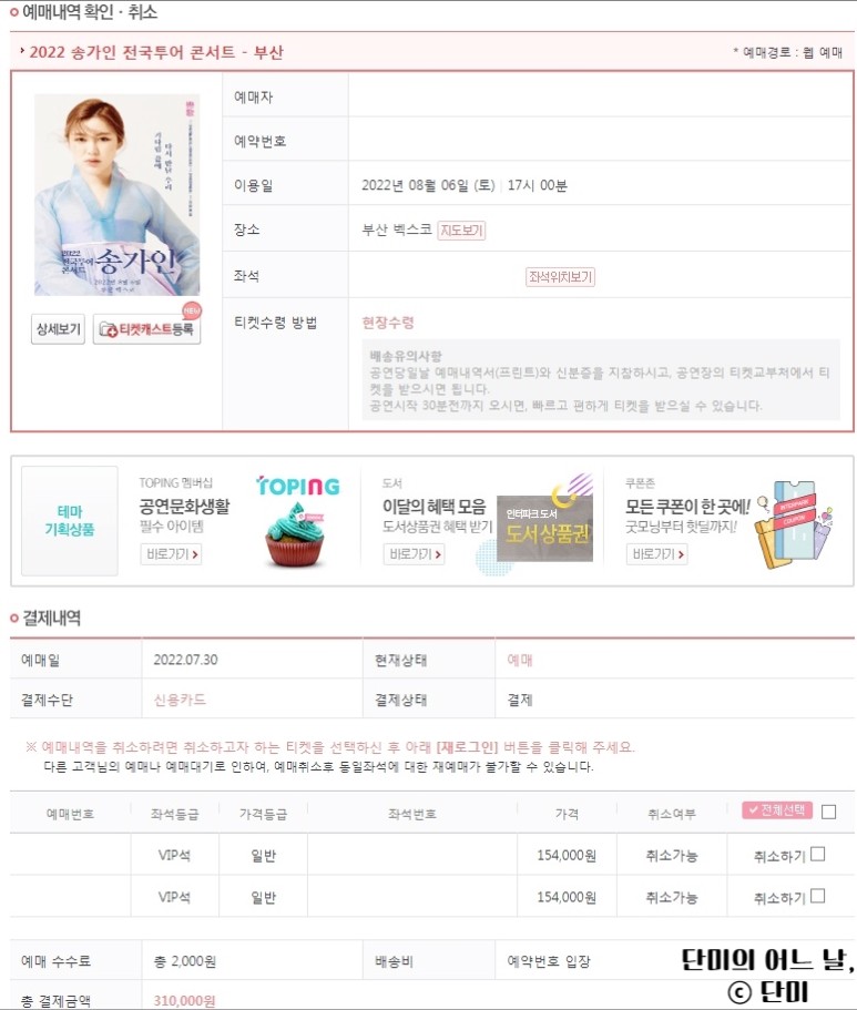 다음날 아빠한테 전화해서 다음주 토요일에 뭐할거야? 물어보면 모른다고 했다.부산에 송가인 콘서트를 하는데 보러 가지 않을래? 라고 말하자마자 가자~~!! 라고 톤이 높아진 우리 아빠.아빠가 좋아하는 목소리를 들으니 덩달아 나도 기분이 좋아졌다.부산에 송가인 콘서트가 있다는 것을 일찍 알았다면 맨 앞자리를 노렸을 텐데 아쉽다.