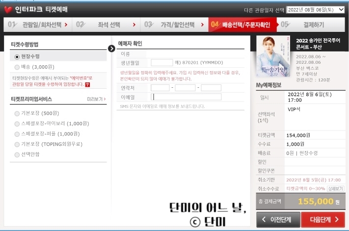 공연 날짜가 다가온 탓인지 배송이 클릭이 안 돼 현장 수령으로 했다.생년월일, 연락처, 이메일을 입력하고 다음 단계로 넘어가세요.