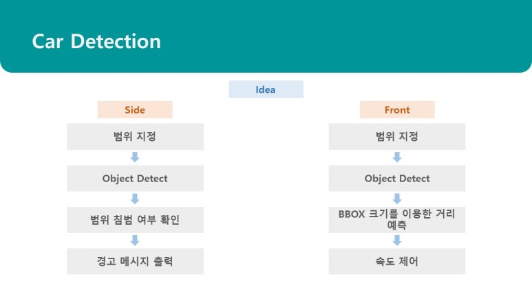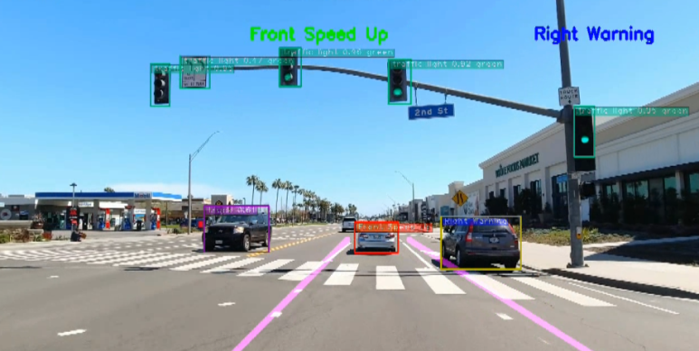 실시간 물체 인식에 뛰어난 성능을 보여주는 YOLOv4를 이용하여 차량과 신호등 그리고 사람을 인식하였습니다.그리고 OpenCV를 이용하여 차선을 인식하고 앞차, 옆차, 가/감속 표시를 해 주었습니다.