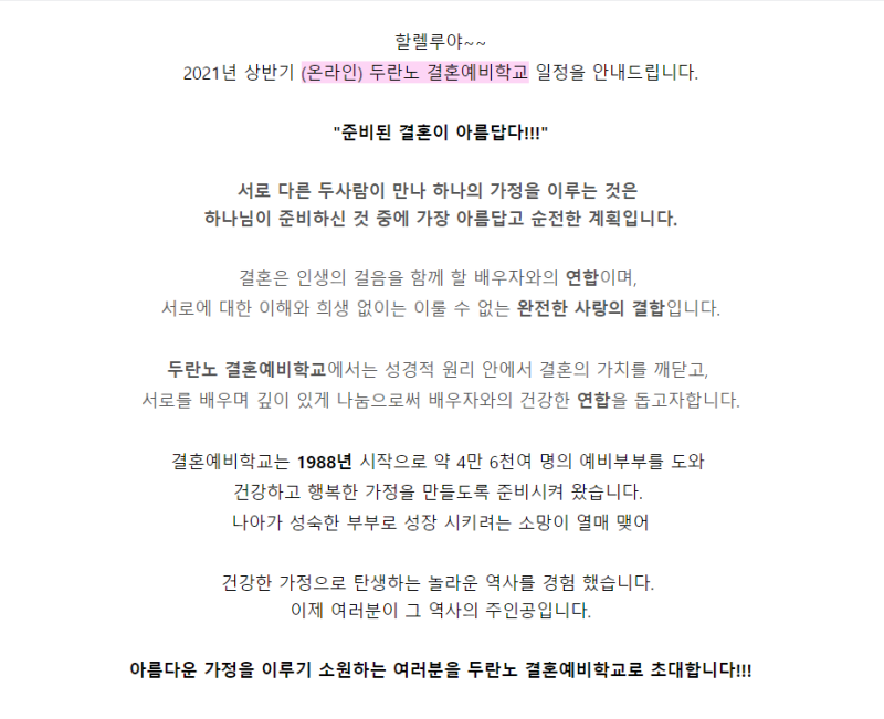 샬롬 59명이 참여한 이번 연애결혼학원이 온라인에서 19명, 오프라인에서 30여명이 참여한 가운데 무사히 마쳤습니다.기수에서 알 수 있듯이 25년간의 연애결혼학원은 시간이 흘러도 세월이 흘러도 많은 젊은이들과 신혼부부들이 행복해 보입니다.