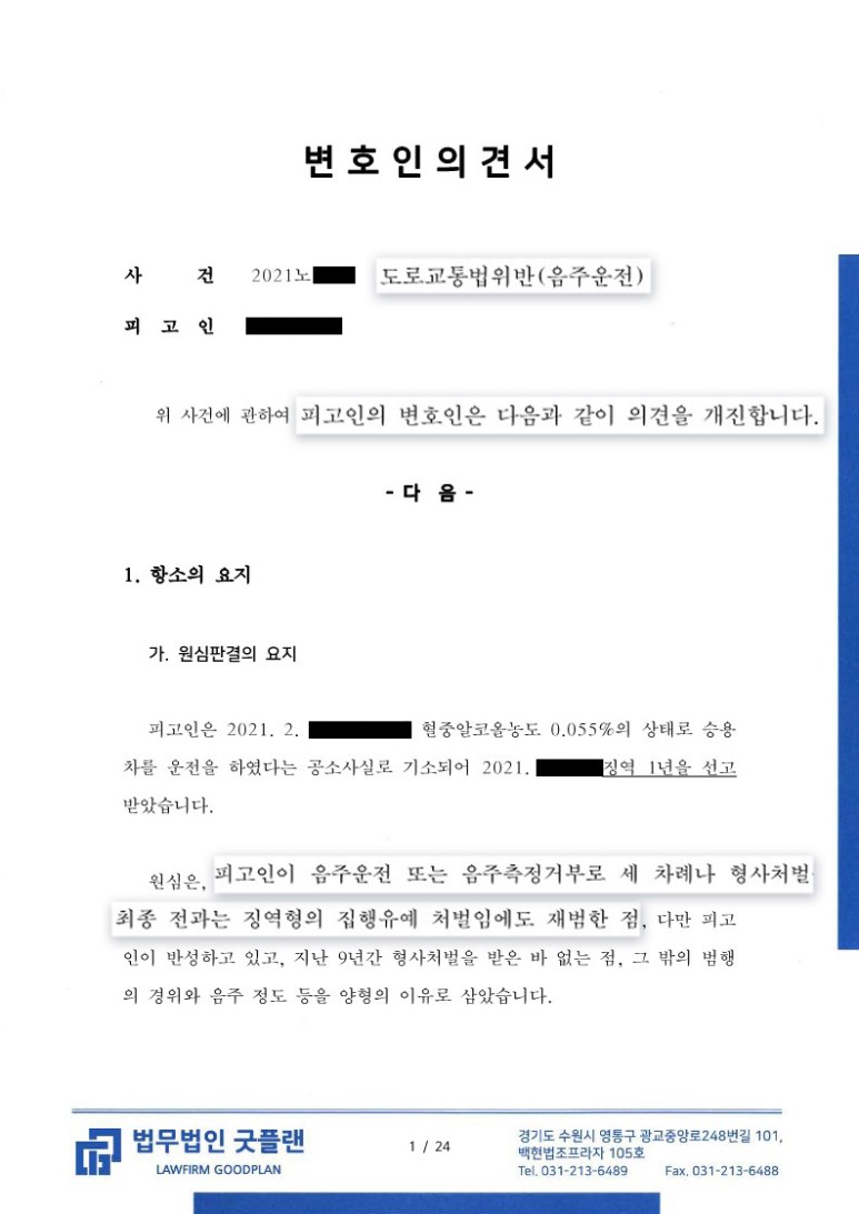 그럼에도 불구하고 의뢰인은 2020년 0.139%의 높은 혈중알코올농도를 보인 상태에서 약 3km 정도 운전하다 경찰단속에 걸리고, 역시 의뢰인에 대한 형사소송이 진행되는데, 위의 H씨 사건과 다른 점이 있다면 사건 초기 경찰단계부터 변호인(굿플랜)의 도움을 받아 사건을 진행하면서